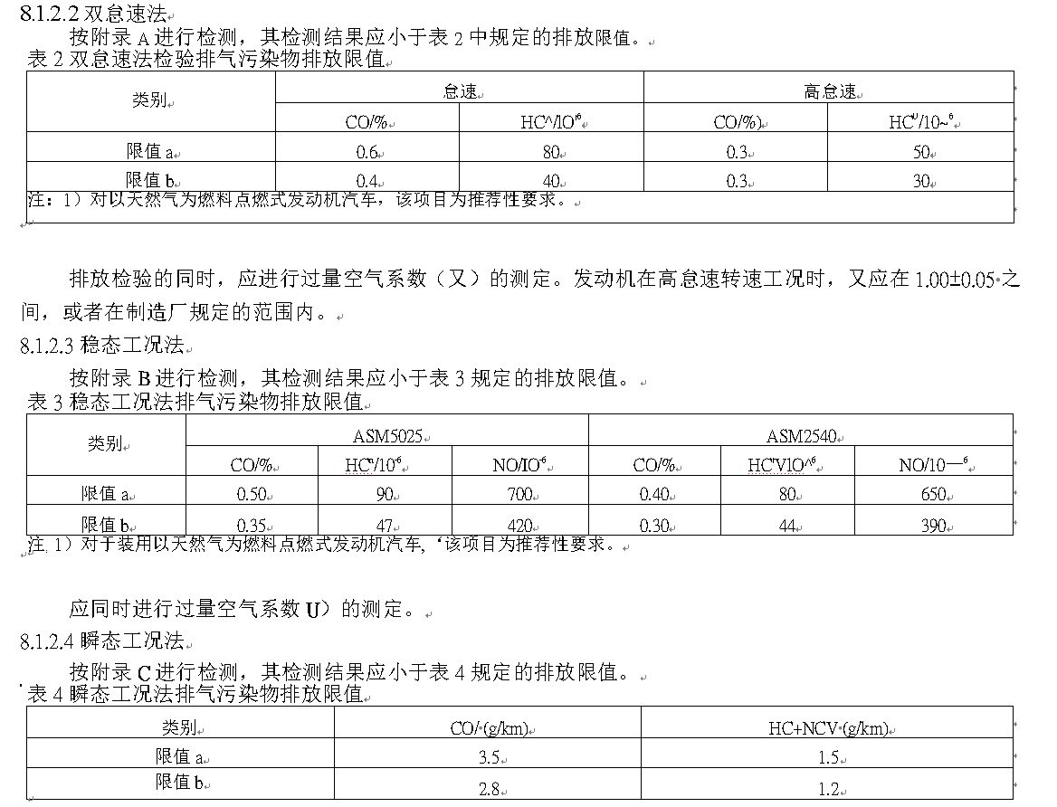 第一:排氣(尾氣)排放標準:點燃式發動機汽車的排氣汙染物排放限值及測量方法有穩態工況法、雙怠速法、瞬態工況法和簡易瞬態工況法4種,其中,穩態工況法和雙怠速法是國家標準(GB 18285-2018)《點燃式發動機汽車排氣汙染物排放限值及測量方法(雙怠速法及簡易工況法)》規定的檢測方法。該標準自2019年5月1日起在全國範圍內強製執行。所謂雙怠速法是指在兩種空轉轉速下進行汙染物排放測量的方法。這種空轉轉速,一種是普通怠速轉速,即車輛使用說明書上規定的怠速轉速,另一種是高怠速轉速。對於高怠速轉速,(GB 18285-2018)規定為50%額定功率轉速或製造廠文件中規定的高怠速轉速時的工況,並把輕型汽車的高怠速轉速規定為2500±100r/min,重型車為1800±100r/min.對於使用閉環控製電子燃油噴射係統和三元催化轉換器技術的汽車,除檢測尾氣中的HC、CO含量外,還要進行高怠速轉速時的過量空氣係數(入)測定。進行入測試前,應按照製造廠使用說明書的規定預熱發動機。雙怠速法對汽車尾氣分析儀的基本要求:能夠測量汽車排放汙染物CO、CO2和HC(用正已烷當量表示)4種成分的體積分數,並能按規定計算過量空氣係數(入)值。CO、HC和CO2采用不分光紅外線法(NDIR),02采用電化學法,也可采用等效方法,但需要證明其等效性。氣體處理係統具有內置發動機轉速和機油溫度測量功能或轉速和機油溫度信號輸入端口。所有部件均由耐腐蝕材料做成,並且此材料對氣體取樣成分無影響。取樣探頭應能經受高溫,並具有限位和固定裝置。儀器應具有符合本標準要求的怠速和高怠速測量程序。